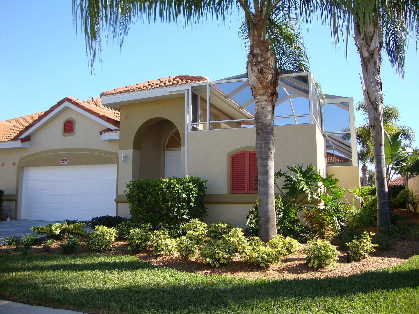 Beautiful home with concrete tile roof. Paver driveway, walk & entire courtyard. Large great room and master bedroom plan with dual sinks, soaking tub & separate shower/toilet area. The home features great livability with oversized screened courtyard area with lots of entertaining space. Large kitchen with solid surface countertops, new range and dishwasher 2025, and cabinet lined laundry room. Secondary bedroom and office wrap the courtyard offering fabulous natural light. Florida living at its best!! Convenient to shopping, medical facilities and the airport.